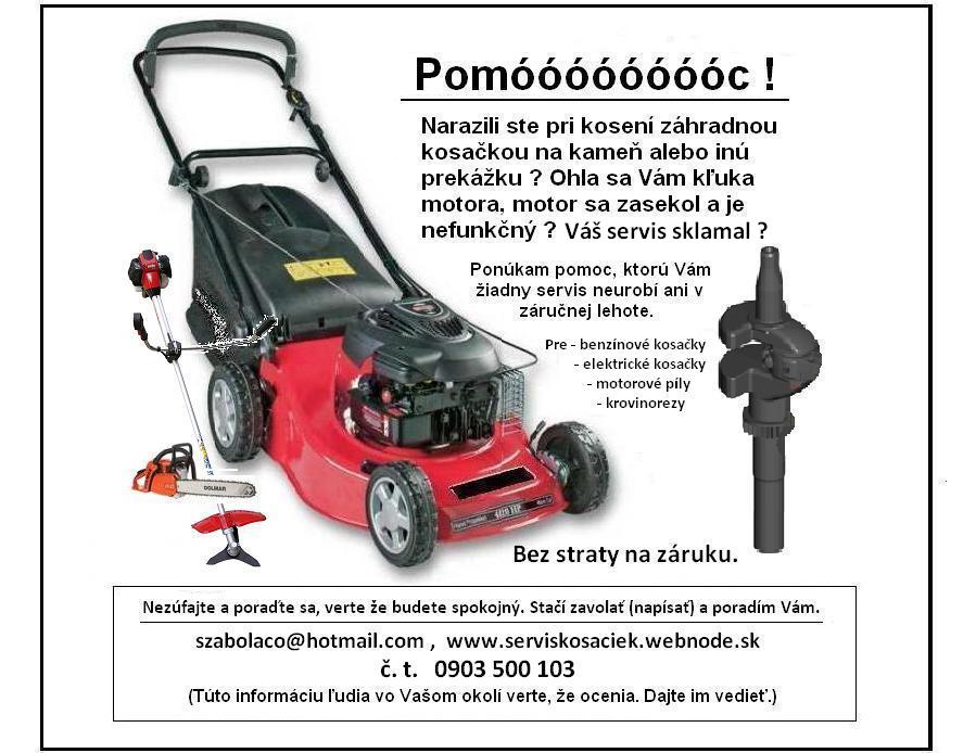 Vyrovnávam ohnuté kľuky záhradných kosačiek bez straty na záruku u všetkých druhov benzínových alebo elektrických motorov, alebo opravujem záhradnú techniku na ktorú iné servisy odmietajú pomoc. Jedná sa hlavne o motory s ohnutou kľukou, zadreté motory, generálky, špeciálne práce na začkové ale aj na neznačkové stroje a zariadenia.